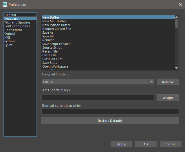 The Assigned Shortcuts dropdown contains all of the hotkeys assigned to the selected operation. Pressing the Remove button to the right will remove the hotkey from the selected operation.