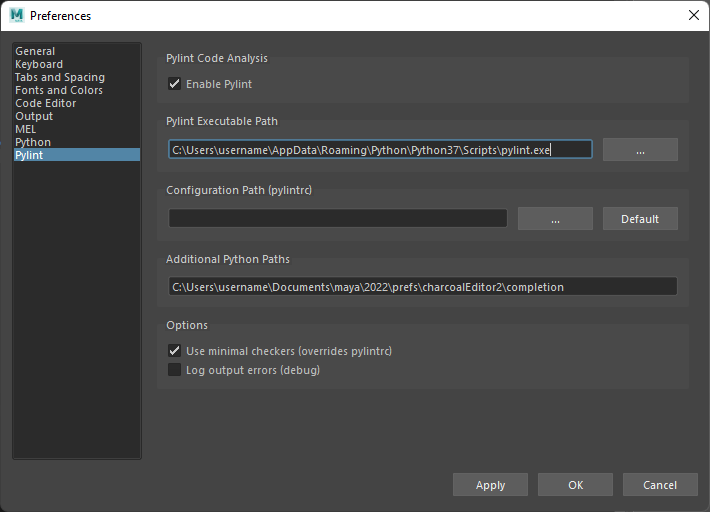 Pylint is a standalone application that can be downloaded or built from source code. The documentation below will provide one method for downloading the executable. Once the application has been copied to the host machine, the location of the pylint executable needs to set in Charcoal Editor 2's preferences.