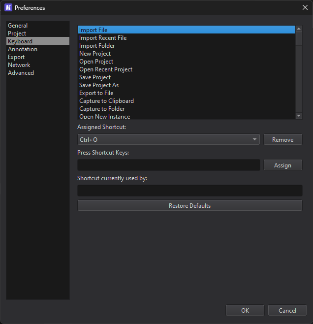 The Assigned Shortcuts dropdown contains all of the hotkeys assigned to the selected operation. Pressing the Remove button to the right will remove the hotkey from the selected operation.